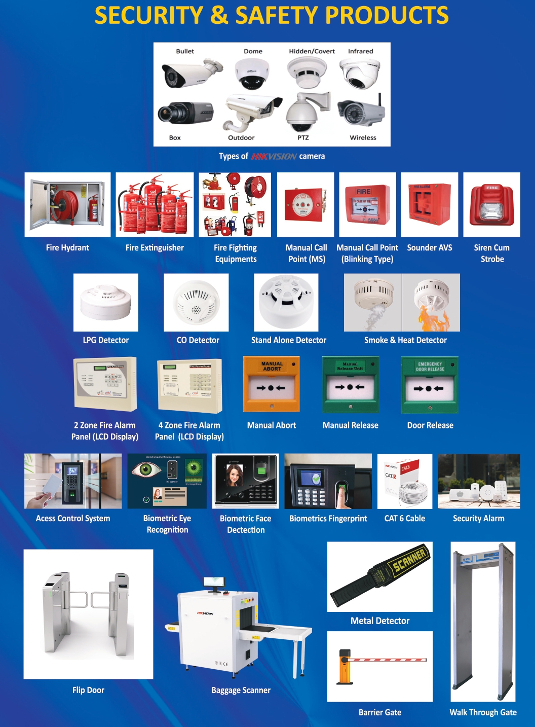 ¬ Conventional and Intelligence Type, Beam Detectors, Smoke and Heat Detectors, Gas Detectors, Automatic Extinguishing System and Voice Messaging System.